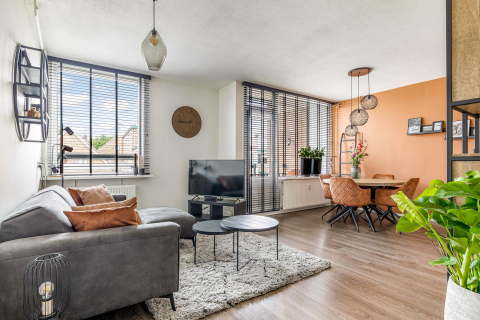 De woonkamer is een plek waar je je meteen thuis voelt. Dankzij de grote raampartijen is er altijd volop daglicht en ervaar je een gevoel van ruimte. De schuifpui geeft toegang tot het balkon, waar je geniet van een prachtig groen uitzicht en waar je op zonnige dagen heerlijk buiten kunt zitten. Of je nu een goed boek leest, samen dineert of gewoon even ontspant, het balkon verlengt je woonkamer naar buiten toe.
